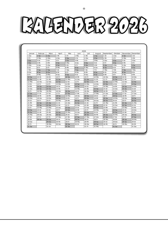 Monat, Tag, Datum, evtl. Sternzeichen, vielleicht auch das Tageswetter, nächster Feiertag und letztlich Namen und Geburtsdaten von netten Freunden und Bekannten eintragen.